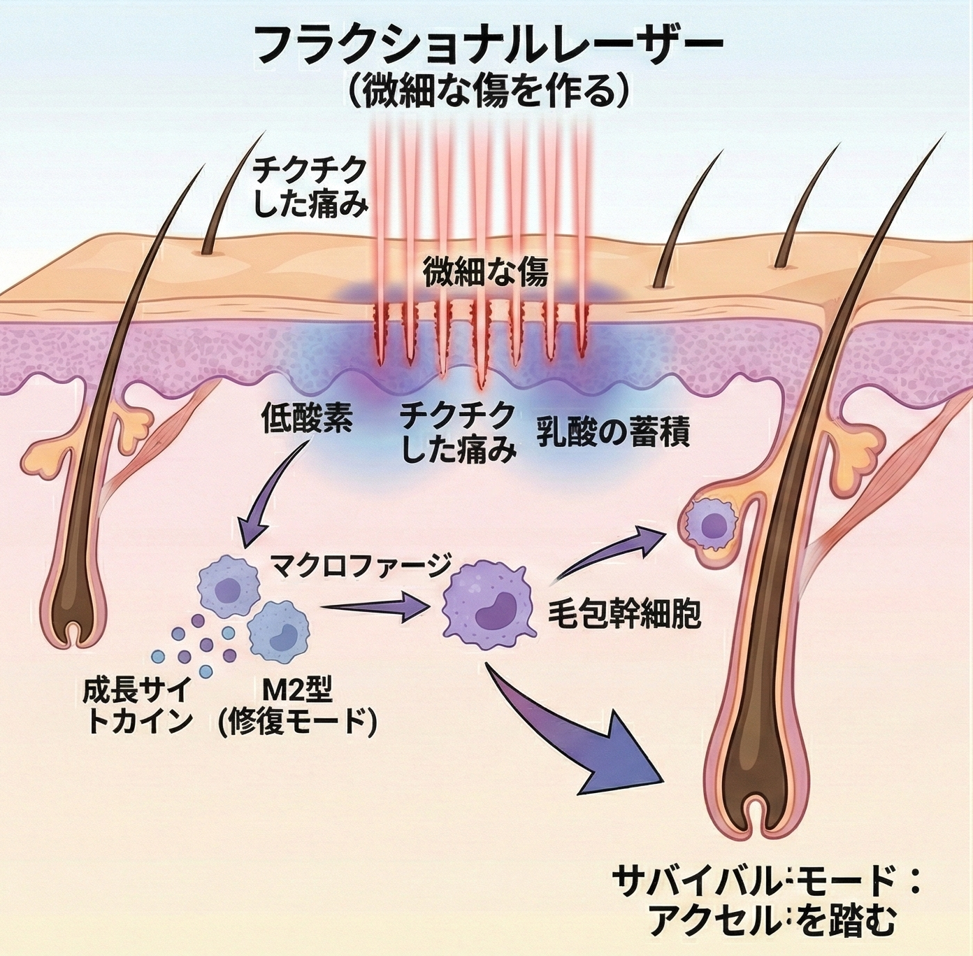フラクショナルレーザーはマイクロニードルとも通じる方法で小さい傷をつけて、低酸素状態をつくり、これにより、この危機的状況を乗り切るためにサバイバルモードにはいります、つまり酸化的リン酸化から乳酸解糖でATPをつくるようになるのですが、ここでの乳酸蓄積がメッセンジャーとなってマクロファージなどから成長系のサイトカインを出させ(乳酸は、低酸素応答因子であるHIF-1αというタンパク質を安定化させます。HIF-1αが活性化すると、マクロファージは「ここは酸素が足りず、ピンチだ。早く組織を修復してインフラを整えなければ」と判断し、抗炎症・組織修復を担うM2型へと極性転換します。)また一方で毛包幹細胞を直接活性化して、休止期から覚醒することになり、これらが発毛のアクセルを踏むことになる
