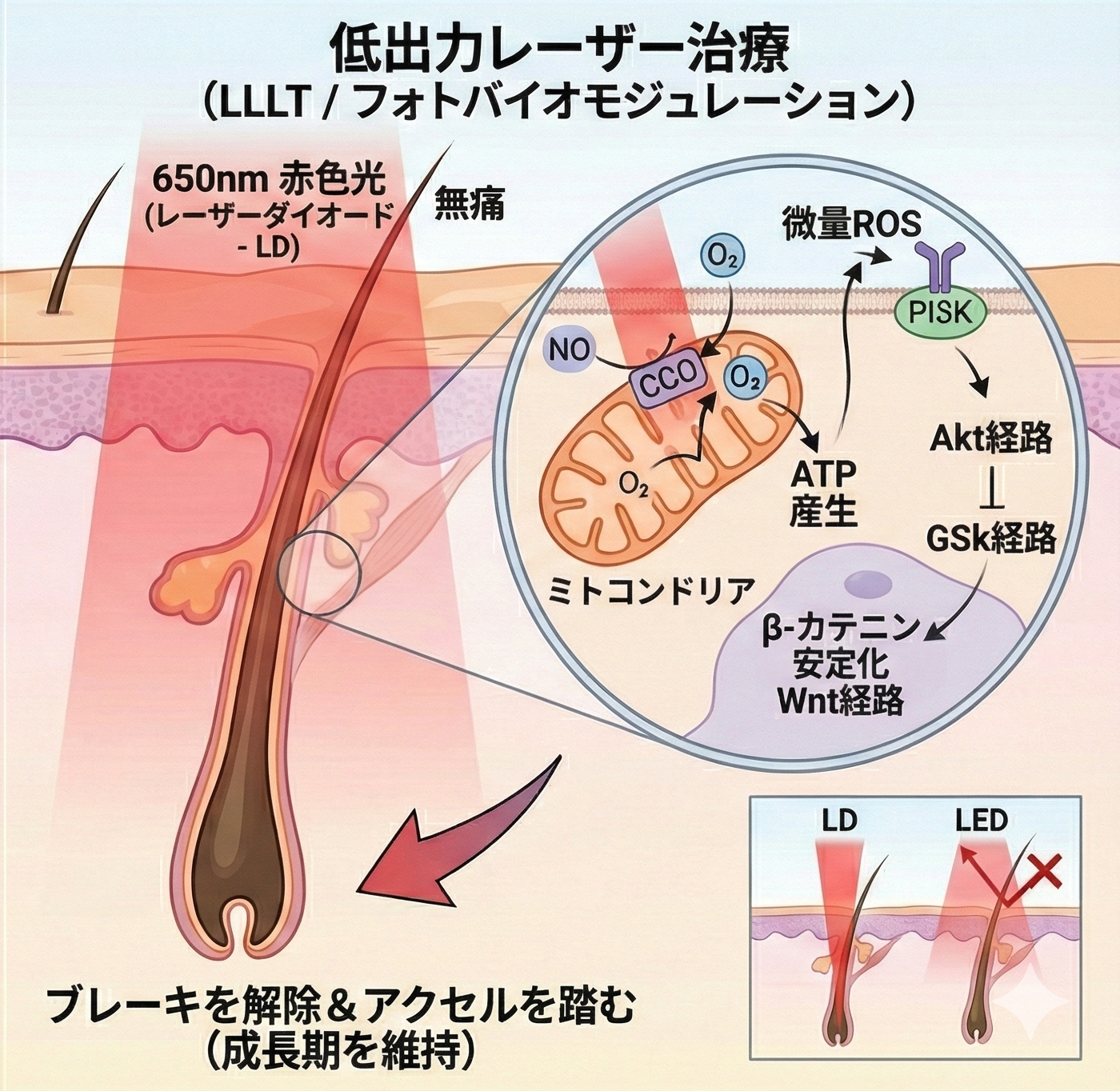 それに対してLLLTではミトコンドリア膜のCCOがNOによるATP産生制御がある状態で、光(650nm付近の赤色光)がCCO内のFeを励起して強制的にNOが外れると 酸素が結合できる状態となり酸化的リン酸化がすすみATPが増産されるその時に放出されるミトコンドリアからの微量ROSがメッセンジャーとなり細胞膜にあるPI3Kを動かすとAkt経路が起動する、 Aktの活性化は、GSK-3βの活性を抑制します。これによりβ-カテニンが安定化し、毛乳頭細胞における毛周期の成長期維持(Wnt経路の強化)に寄与し、結果成長のブレーキを排除してアクセルを踏み込むことになります。