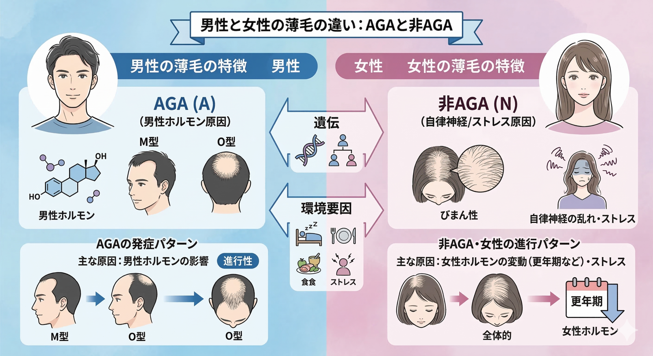 一つは男性ホルモンが原因の薄毛AGA(これをAとしておきます、こちらは生存戦略的に起きます)と非AGA、非AGAは主に生まれながら自律神経過敏か抗ストレス感受性低下が原因の薄毛(これをNとしておきます、こちらはプログラムのバグとして起きます)です、そしてこれのなりやすさが遺伝で決まってます。まずNにおいて、ストレスが誘因となりますが、女性は月経をはじめホルモン変動ストレスがかかりやすいため、女性に多いと言えます。Aのほうは男性ホルモンですのでやはり男性に起きやすい。女性ホルモンは男性ホルモンから作られるため女性でも起きますが女性ホルモンの強力な発毛作用で隠され気味です。ただ更年期となっていままで男性ホルモンの影響を打ち消していた女性ホルモンが減ると、ここでAが進行してくるのです。