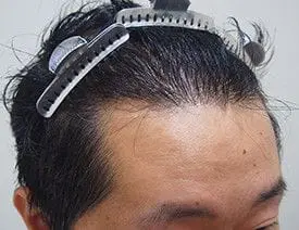 施術の解説 アンシェーブン法。加齢により薄くなった前頭部に、合計2,000株を移植。毛量を回復させ、若々しい印象へ改善。 主なリスクと副作用について 術後のショックロスならびにごく希に採取部にも円形脱毛状の一時的脱落が起こる可能性がある。また、移植毛は若干クセ毛になる。移植部に知覚鈍磨が起こる等々 男性 / 40代 / M字の生え際 / 1,640グラフト 施術前