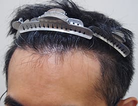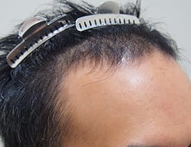 また、移植毛は若干クセ毛になる。移植部に知覚鈍磨が起こる等々 男性 / 40代 / 生え際中央部、左右M字の部分 / 1,580グラフト 施術前