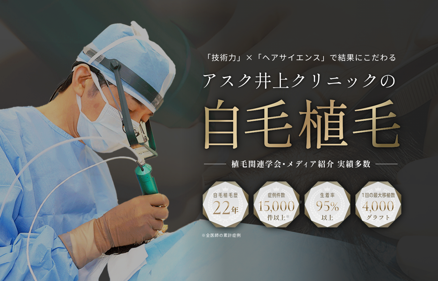 - アスク井上クリニックでは、患者様一人ひとりの状態に合わせた自毛植毛を提供しています。当院独自の「i-SAFE」技術を用いた施術では、後頭部から健康な毛根を採取し、薄毛が気になる部位に移植します。この方法を用いることで、メスを使用しなくても、自然な仕上がりと高い生着率を実現します