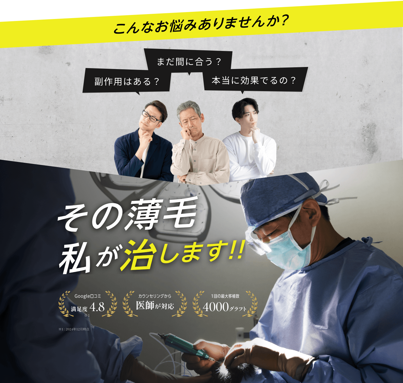 当クリニックでは、医学的根拠に基づいた治療を提供することはもちろん、何よりも患者様から信頼される薄毛治療のクリニックとなることを目指しています。患者様一人ひとりの悩みに真摯に向き合い、最適な治療法を提案することで、満足いただける結果を実現してまいります。